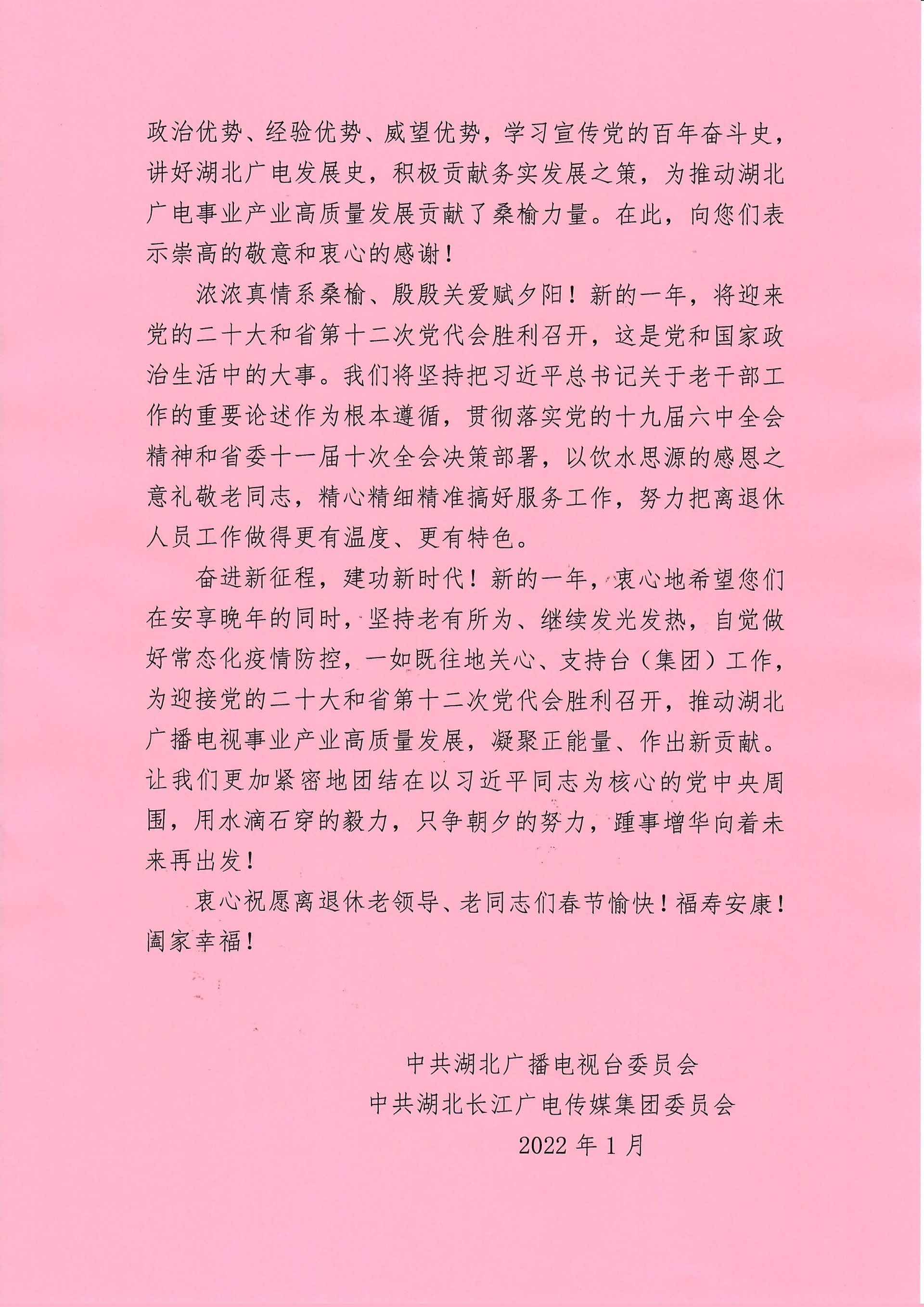 新的一年,台(集团)党委希望全台(集团)离退休老同志在安享晚年的同时,坚持老有所为、继续发光发热,自觉做好常态化疫情防控,一如既往地关心、支持台(集团)工作,为迎接党的二十大和省第十二次党代会胜利召开,推动湖北广播电视事业产业高质量发展,凝聚正能量、作出新贡献。