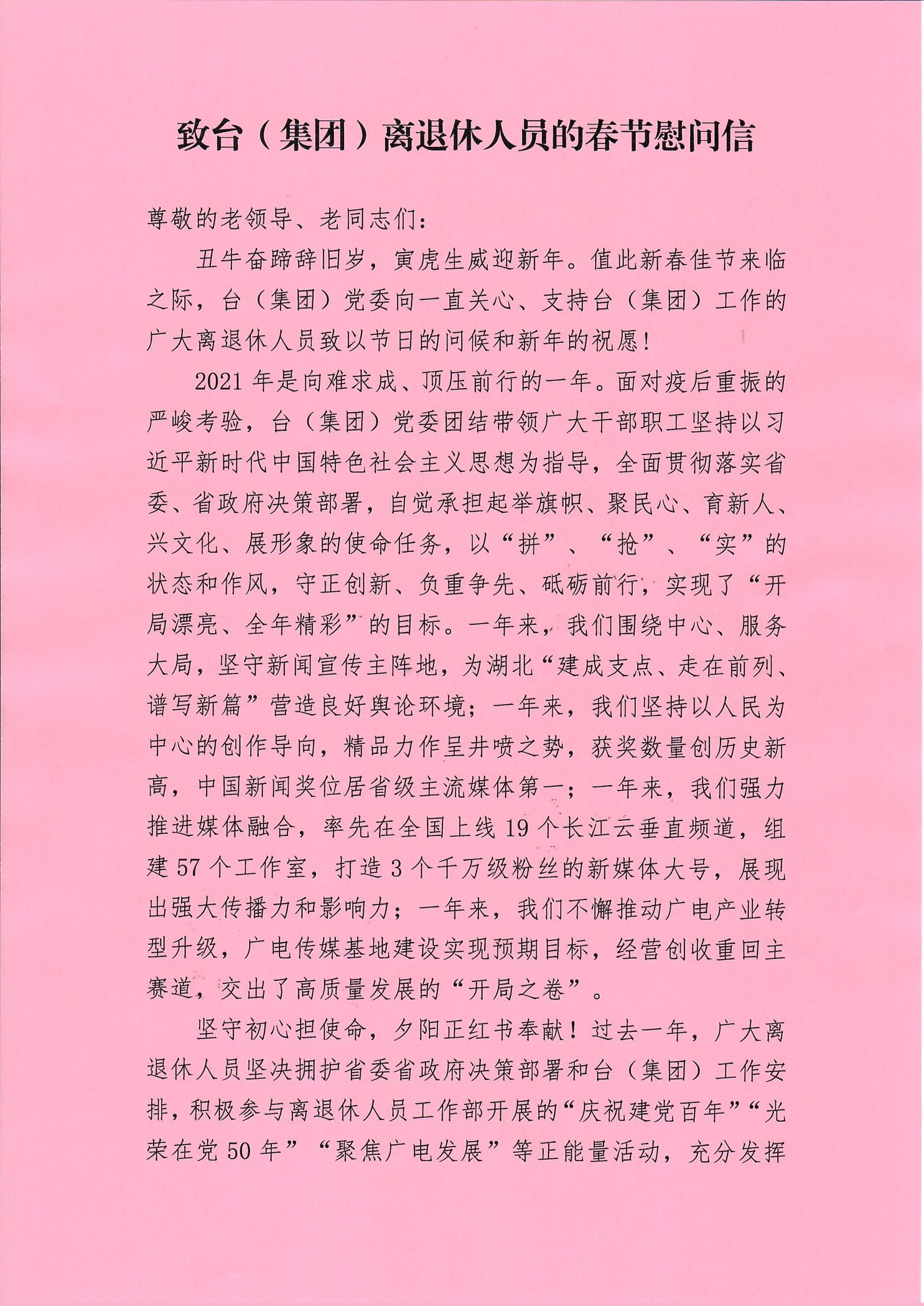 慰问信指出,2021年是向难求成、顶压前行的一年。面对疫后重振的严峻考验,台(集团)党委团结带领广大干部职工坚持以习近平新时代中国特色社会主义思想为指导,全面贯彻落实省委、省政府决策部署,自觉承担起举旗帜、聚民心、育新人、兴文化、展形象的使命任务,以“拼”、“抢”、“实”的状态和作风,守正创新、负重争先、砥砺前行,实现了“开局漂亮、全年精彩”的目标。