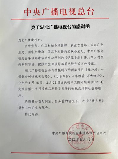 由我台纪录片部参与制作的中宣部“中华优秀传统文化传承发展工程”重点项目《记住乡愁》(乡村振兴系列)湖北篇——《钱冲村:一棵黄金树铺就黄金路》《万古寺村:四季橙香 万古流芳》分别于今年1月18日、2月24日在央视中文国际频道(CCTV-4)首播,节目播出后取得了良好的收视成绩和社会影响力。近日,中央广播电视总台发来感谢信,感谢我台对《记住乡愁》摄制工作的全力配合。