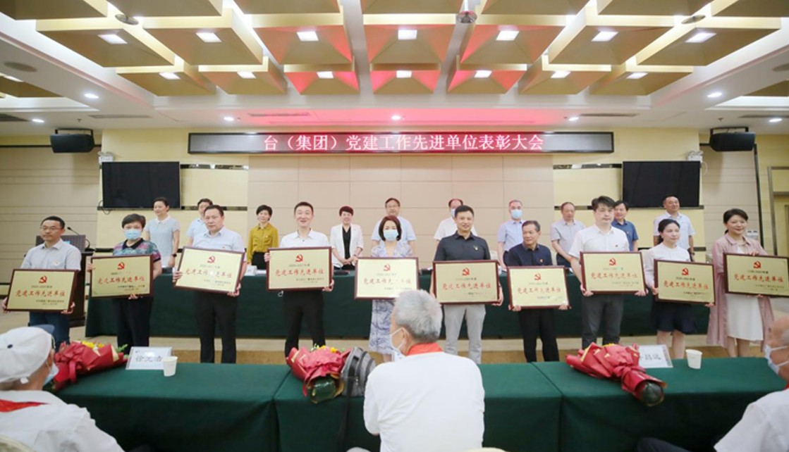 7月1日上午,台(集团)召开党建工作先进单位表彰大会, 为2022年台(集团)“光荣在党50年”的老党员颁发纪念章,表彰2020-2021年度台(集团)党建工作先进单位。