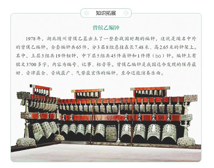 在教科书第二单元介绍夏商周时期内容时,曾侯乙编钟的照片跨第20和21两个页面,第49页《知识拓展》栏目图文并茂地又做了介绍(如图)。