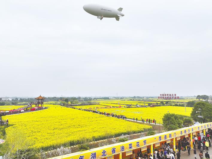 祥云AS700载人飞艇亮相,为花海增添几分科技与现代气息。 (湖北日报全媒记者 张诗秋 摄)
