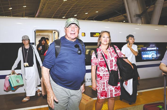 7月26日晚,美中航空遗产基金会主席杰夫·格林(前左)、飞虎队老兵后代安娜·安东尼娅·李一行乘高铁抵达武汉。(湖北日报全媒记者 陈迹 摄)