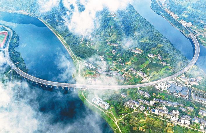 7月27日,十堰市竹山县潘口乡,G346国道在晨雾中跨过堵河,穿过田野,如一条美丽的玉带,将山、水、村落紧紧相连。近年来,我省大力推进交通基础设施建设,不断优化城乡交通路网布局,构建起以高速为骨架、国道省道为支撑、县乡公路为脉络的综合交通运输网络。(视界网 邵义龙 摄)