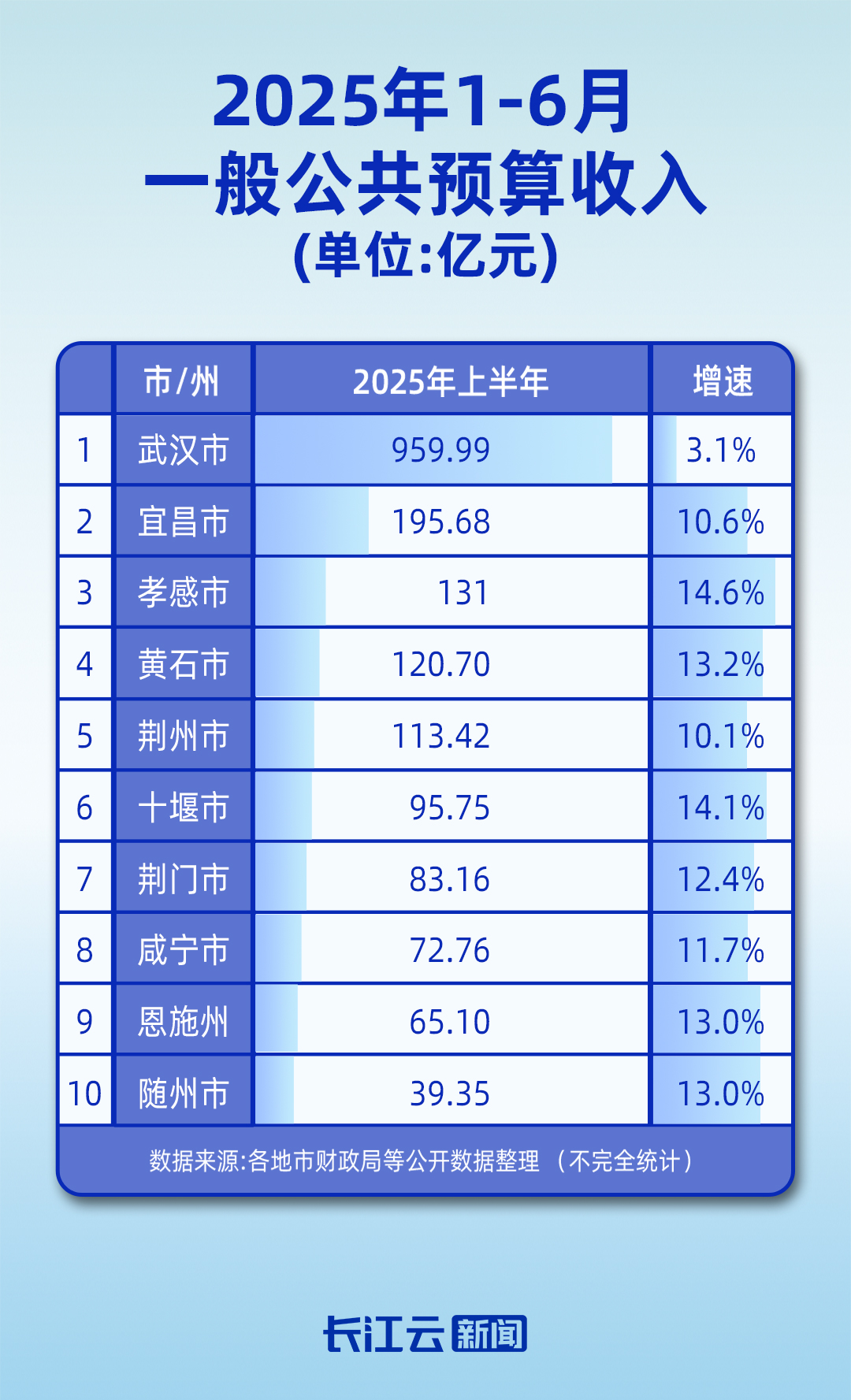 湖北市州2025年1-6月一般公共预算收入总量排行前十