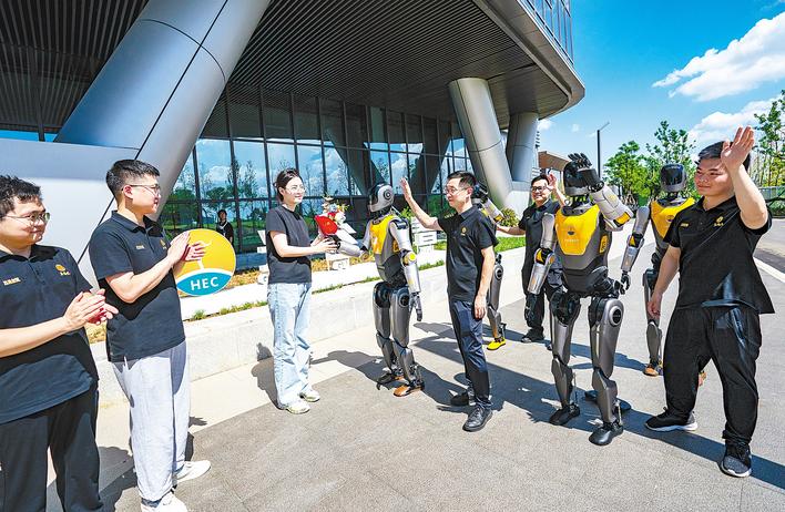 8月22日,在首届世界人形机器人运动会上夺得群体首金、湖北首金的部分“光子”人形机器人和技术团队,载誉回到武汉。(湖北日报全媒记者 魏铼 摄)