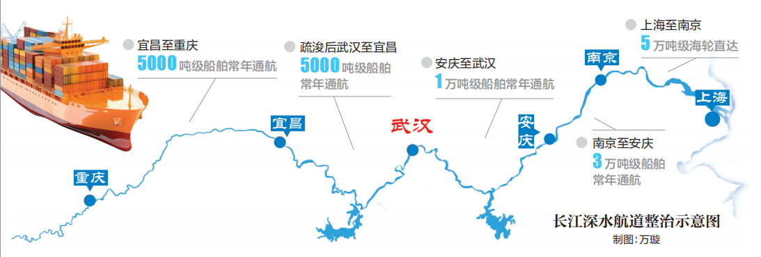 2018年,从南京到长江入海口12.5米深水航道全线贯通,5万吨级海轮可直达南京。2024年4月,武汉至安庆段6米水深航道整治工程建成并通过竣工验收,满足万吨级船舶常年通航需求,让武汉“江港”变“海港”。2024年9月,长江上游重庆朝天门至涪陵河段航道整治工程通过整体交工验收,三峡库区4.5米深水航道由涪陵上延至重庆中心城区,三峡豪华邮轮和5000吨级货轮可常年满载通航。