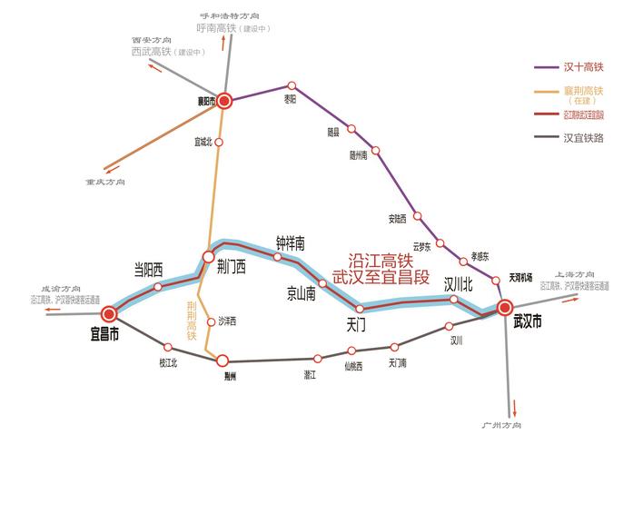 沪渝蓉高铁武宜段起自武汉市,经天门市、荆门市,终至宜昌市,正线全长313公里,设计时速350公里,新建桥梁88座、隧道25座,桥隧占比85%。全线共设8座车站,其中汉口站为既有站,汉川北、天门、京山南、钟祥南、荆门西、当阳西、宜昌北为新建车站。荆门西站部分工程已随荆荆高铁于2024年底投用。