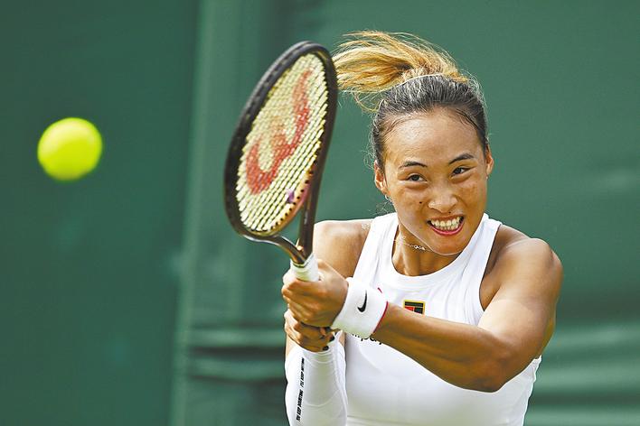 7月1日,英国伦敦,郑钦文在2025温布尔登网球公开赛女子单打首轮比赛中奋力回球。 (新华社发)