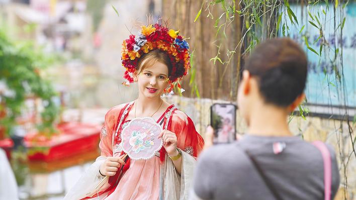 10月4日,一名外国游客在钟祥莫愁村执团扇、着汉服,浸润中国文化,定格古风瞬间。(湖北日报全媒记者 陈少哲 摄)