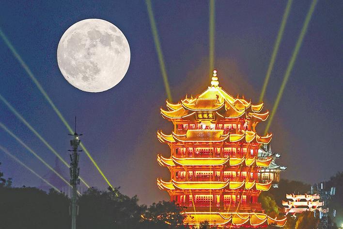 10月6日晚,中秋佳节,武汉黄鹤楼上明月高悬,极具诗意。 (注:图片使用多重曝光现场拍摄 湖北日报全媒记者 何宇欣 摄)