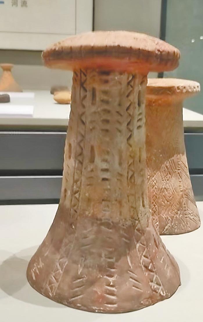 三峡移民博物馆展出的柳林溪遗址陶支座,上面的刻划符号被学术界认为是距今7000年前的早期人类文字。(湖北日报全媒记者 何凡 摄)
