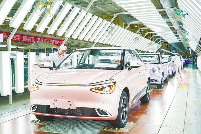 奕派科技襄阳工厂总装车间,纳米01整车下线。(湖北日报全媒记者 赵怡然 摄)
