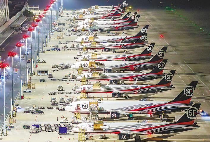 夜幕降临,鄂州花湖国际机场的跑道上,灯火璀璨,近百架次货机起降。