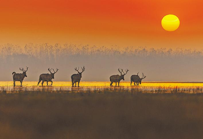 11月27日清晨,一群麋鹿在石首天鹅洲长江故道里漫步。(湖北日报全媒记者 柯皓 摄)