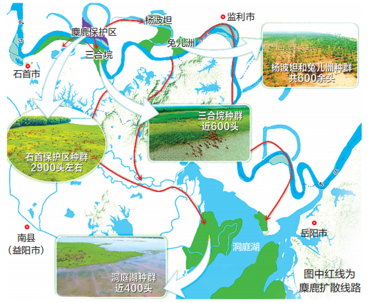 1996年起,石首麋鹿开始从保护区向外扩散,部分顺长江北岸向东进入小河口镇杨波坦村黑瓦屋长江故道洲滩,再东拓至监利境内兔儿洲,这两个麋鹿种群有600余头。1998年长江枯水季节,保护区部分麋鹿南渡长江,抵达石首东升三合垸洲滩扎根繁衍,种群数量近600头。其中11头由石首调关镇沿河流南下湖南华容终南乡,最后8头到达洞庭湖畔。