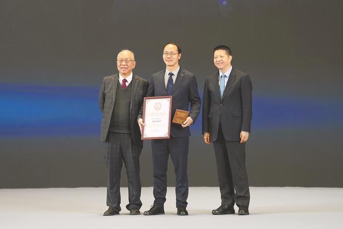 袁新意(中)在第十届世界华人数学家大会领奖。(受访者供图)