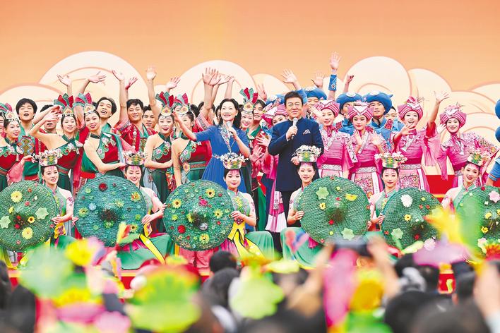 戏曲联唱更添文化交融之韵,京剧名家王艳与恩施南剧传承人杨理理合作《贵妃醉酒》,黄梅戏名家新秀联袂呈现《女驸马》经典片段,不同剧种的对话,成为文艺“结对子”的生动实践。当演员们携手唱响《母亲是中华》时,“石榴籽”紧紧相拥的深情表达打动人心。