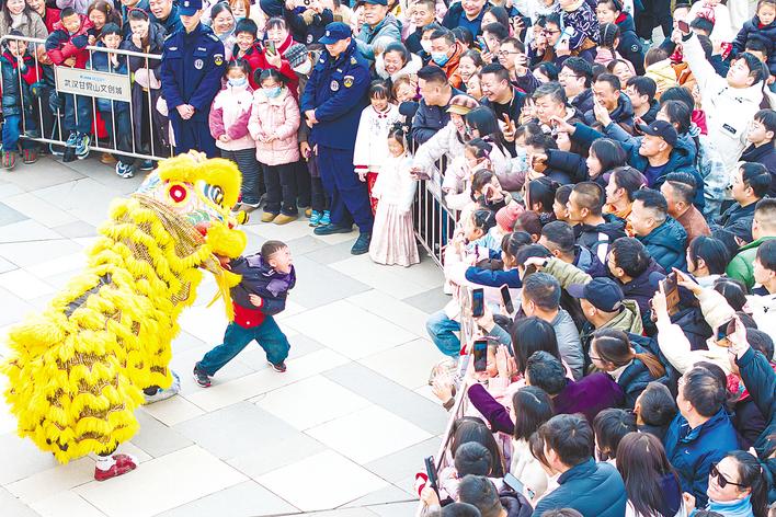 2月17日下午,在武汉甘露山文创城前广场,两头醒狮摇头摆尾,在梅花桩上腾跃起舞,吸引众多市民驻足观看,孩子们争相摸摸雄狮头,祈愿新年好运。 (湖北日报全媒记者 任勇 通讯员 李正洲 摄)
