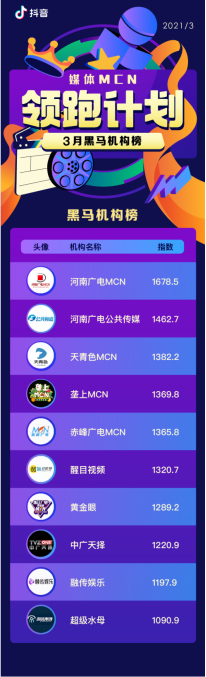 近日,抖音公布媒体MCN三月排行榜,垄上MCN超越长沙中广天择MCN、浙江广电黄金眼、海南广电超级水母MCN。位列媒体MCN领跑计划黑马榜第四位,相较年初上升四位,呈现积极的抬升势头。此排行榜涵盖全国百多家媒体MCN,是传媒领域新媒体运营领域权威风向标,每两月公布一次排名数据。