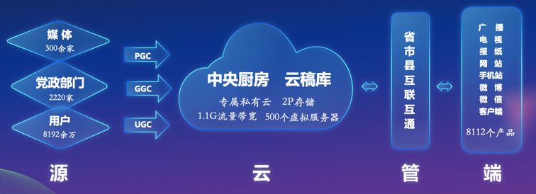 目前,长江云平台上有300多家媒体、2220家党政部门、8000多万综合用户,来自这些渠道的信源,进入中央厨房,通过互联互通的长江云平台,覆盖到8000多个产品上。