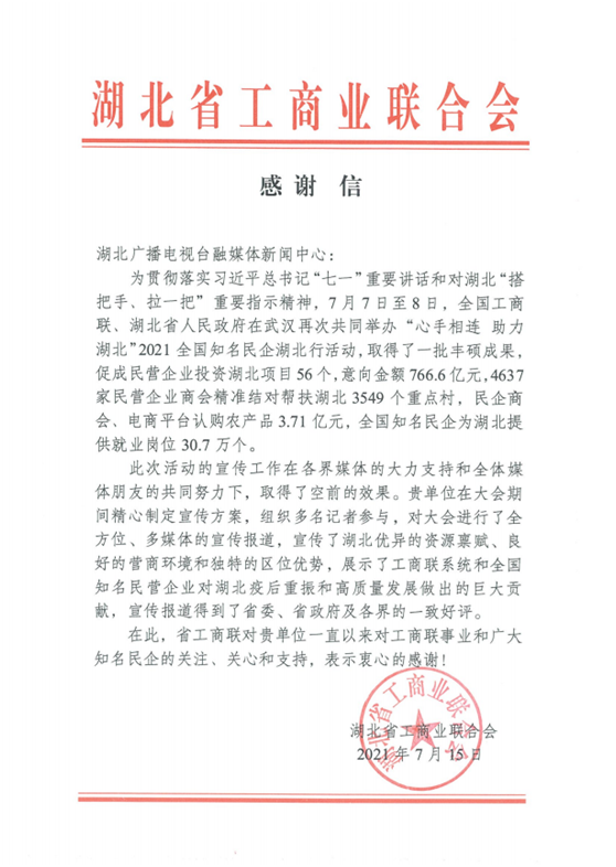 7月16日,湖北省工商联代表“全国知名民企湖北行”工作组向我台融媒体新闻中心发来感谢信,感谢湖北广电对该活动精心策划及宣推工作。